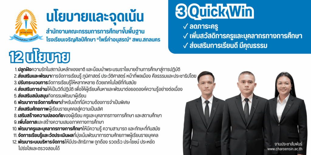 โรงเรียนเจริญศิลป์ศึกษา “โพธิ์คำอนุสรณ์” ขอนำเสนอนโยบายและจุดเน้นของสำนักงานคณะกรรมการการศึกษาขั้นพื้นฐาน เพื่อเป็นแนวทางในการพัฒนาคุณภาพการศึกษา และยกระดับการเรียนรู้ของผู้เรียนอย่างต่อเนื่อง