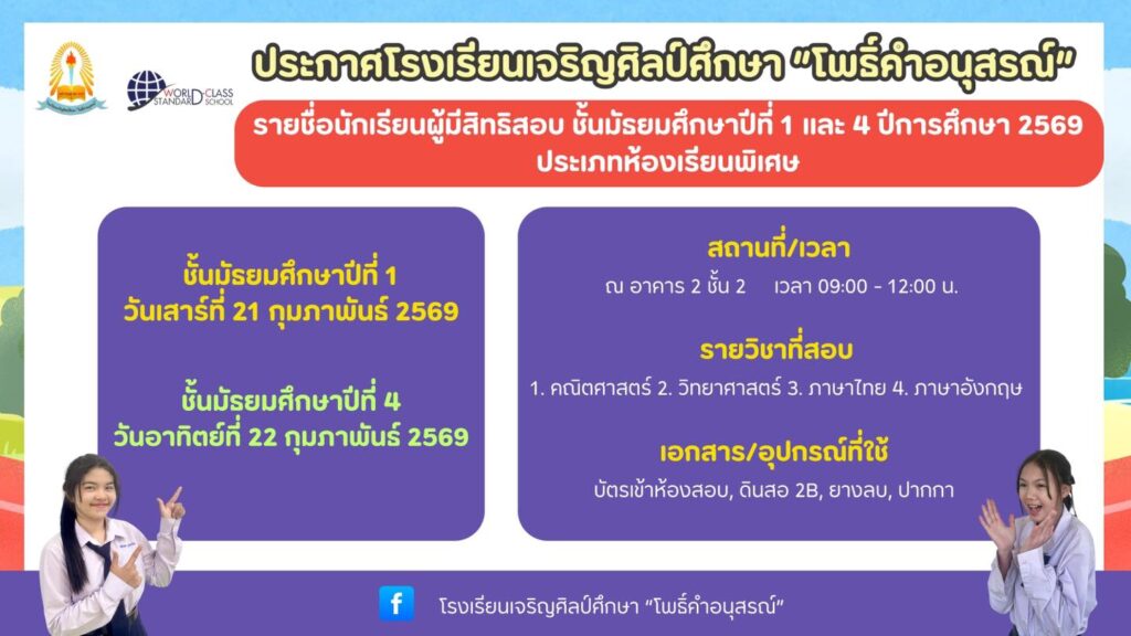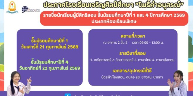 ประกาศโรงเรียนเจริญศิลป์ศึกษา “โพธิ์คำอนุสรณ์” เรื่อง รายชื่อนักเรียนผู้มีสิทธิสอบคัดเลือกเข้าศึกษาต่อชั้นมัธยมศึกษาปีที่ 1 และ 4 ห้องเรียนพิเศษ ปีการศึกษา 2569 admin 20 กุมภาพันธ์ 2026 งานทั่วไป 29 Views คลิกที่นี่