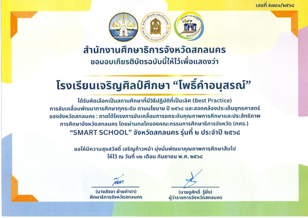 ในโอกาสนี้ นายชุติศักดิ์ รุ่งสัย ผู้ว่าราชการจังหวัดสกลนคร ได้ให้เกียรติมอบเกียรติบัตรรับรองการเป็น “SMART SCHOOL” จังหวัดสกลนคร รุ่นที่ 2 ประจำปี 2568 ให้แก่โรงเรียน