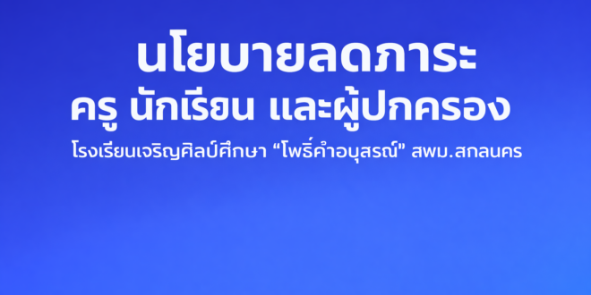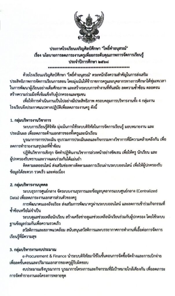 โรงเรียนเจริญศิลป์ศึกษา “โพธิ์คำอนุสรณ์” ได้ประกาศแนวทางสำคัญเพื่อขับเคลื่อนการจัดการศึกษาให้มีประสิทธิภาพ โปร่งใส และเป็นธรรม โดยมุ่ง “ลดภาระ” ที่ไม่จำเป็นของทุกฝ่าย พร้อมพัฒนาคุณภาพการเรียนรู้ให้เกิดผลจริงในห้องเรียน ครอบคลุม 3 ด้านหลัก ได้แก่ ลดภาระผู้ปกครอง ลดภาระนักเรียน และลดภาระงานครูเพื่อยกระดับคุณภาพการจัดการเรียนรู้