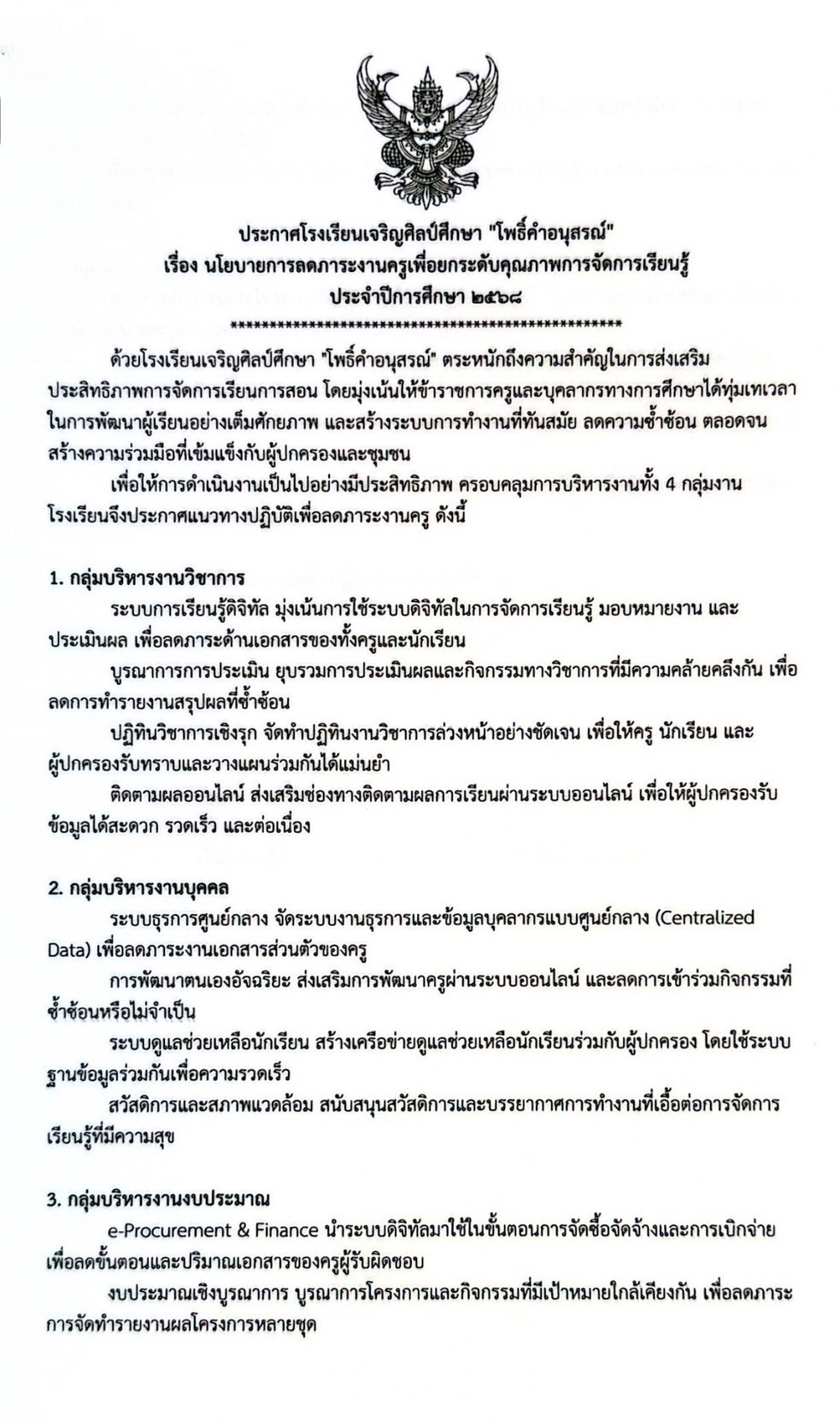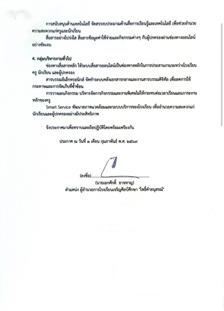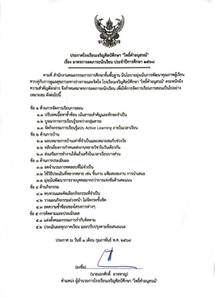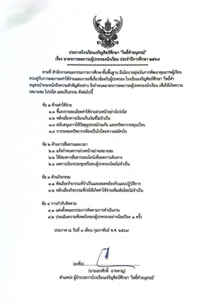 โรงเรียนเจริญศิลป์ศึกษา “โพธิ์คำอนุสรณ์” ออกประกาศ 3 มาตรการ ลดภาระครู–นักเรียน–ผู้ปกครอง ยกระดับคุณภาพการจัดการเรียนรู้